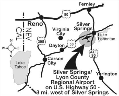 Home Lyon County Fly-In Silver & Snowflakes Holiday Tree Lighting Legends of the West Bike & Car Fest Leather & Lace Motorcycle Poker Run Winter Wine and other CACC Events Treadway Park Re-Dedication Celebration Silver Springs Airport Carson City History and more... About Us LOCATION: Silver Springs/Lyon County Regional Airport, on Highway 50 East 3 miles east of Silver Springs, Nevada |